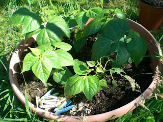 Tumbling tomatoes - look like they might bear fruit this year. My tomato-growing skills stayed behind in Norfolk when we moved. In the last two years I think I've grown five tomatoes in total. Nothing like the glut I used to get in Norfolk. So I'm watering and feeding them diligently this year. Here's hoping.
